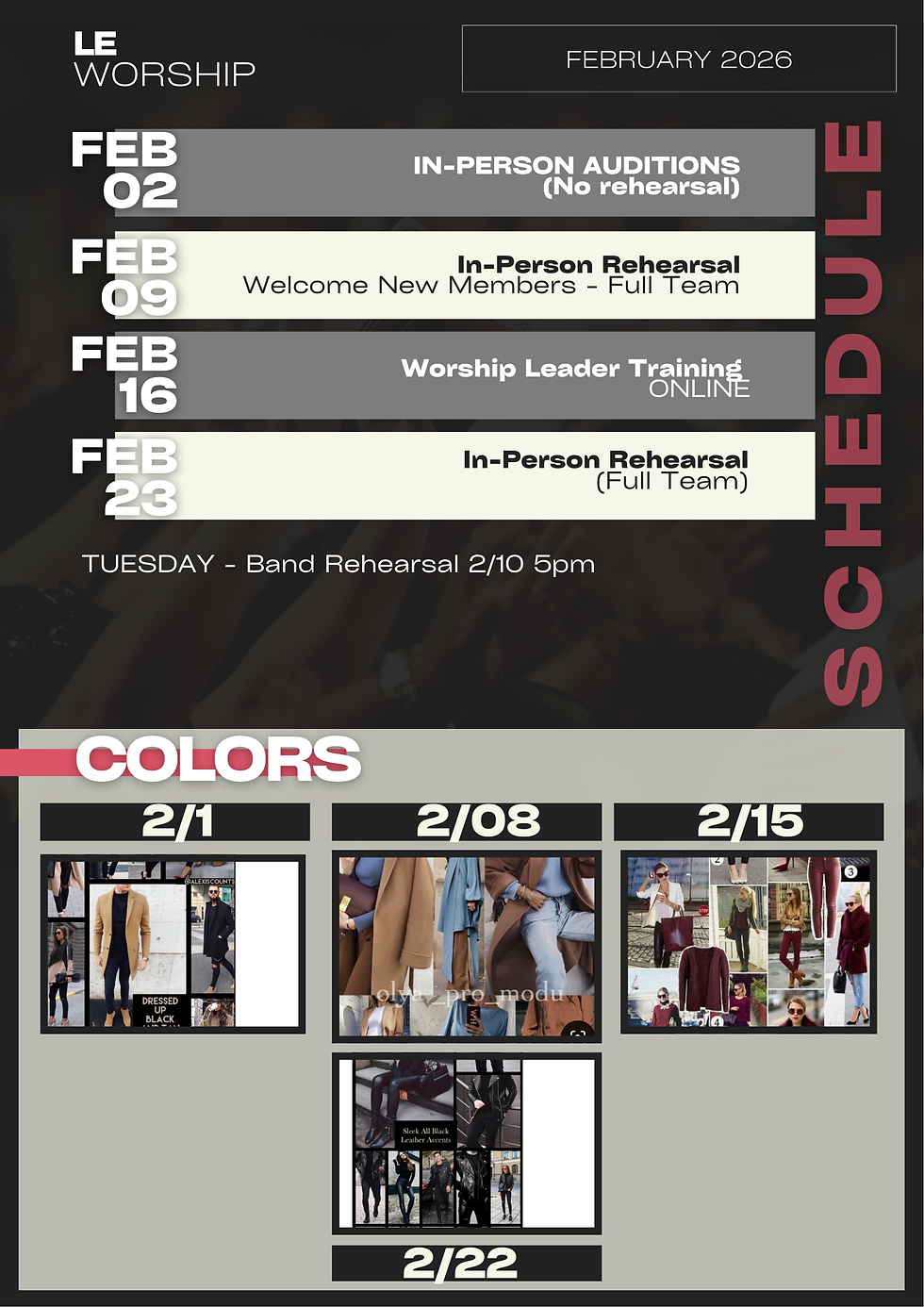 FEBRUARY 2026 - Team UpdatesLE WORSHIPDec 31, 20251 min readUpdated: Feb 2REHEARSAL & CHURCH CALENDARBAND REHEARSAL(S)